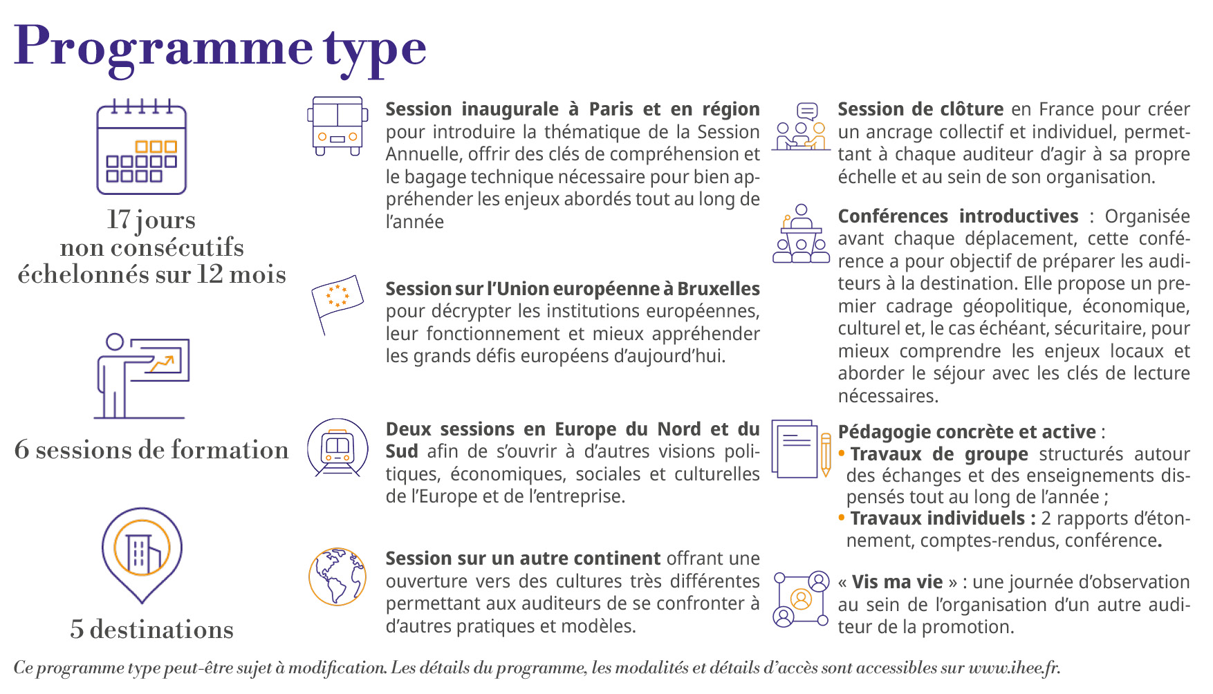 Le programme de l’IHEE compte 17 jours de formation, non consécutifs, échelonnés sur 12 mois et se décline sous la forme de sessions de formation et de voyages d’étude.