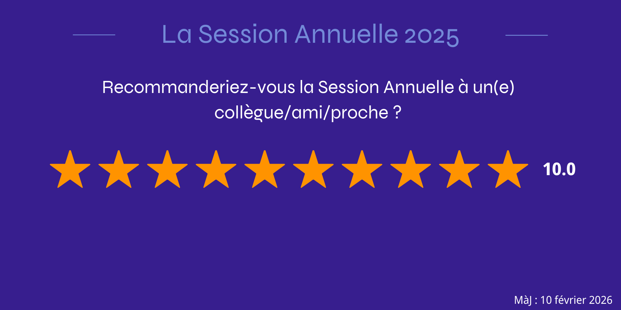 Parmi les questions posées figurait notamment leur disposition à recommander la Session Annuelle à un(e) collègue, ami(e) ou proche. Voici leurs réponses :